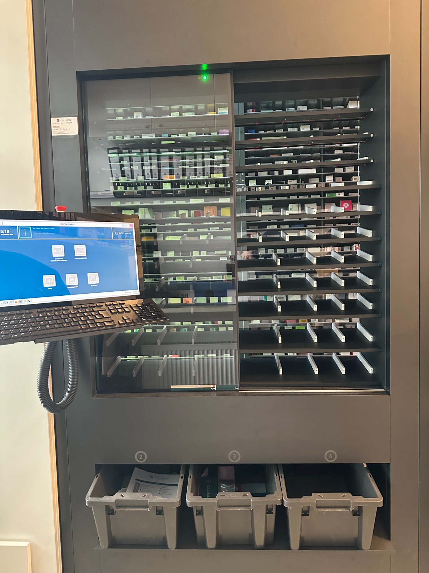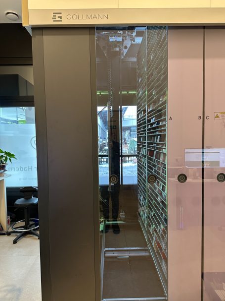 In unserer Apotheke am Haderner Stern arbeiten wir mit einem hochmodernen Kommissioniersystem der Firma Gollmann – einem der neuesten und schnellsten Systeme in München. Der Automat unterstützt unser Team im Hintergrund und sorgt dafür, dass Ihre Medikamente innerhalb weniger Sekunden bereitgestellt werden.
